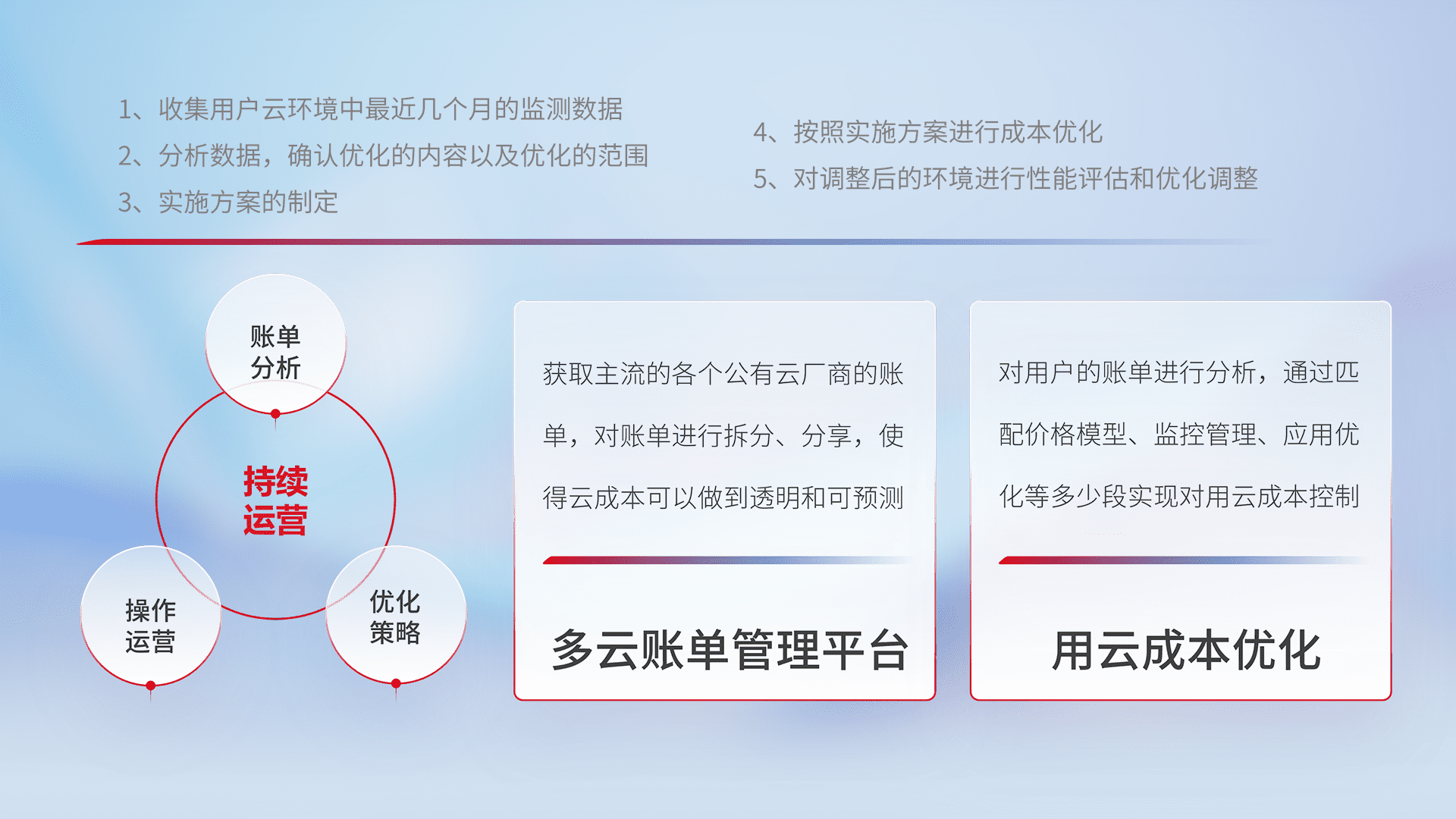 通过多云纳管,,,以统一的资源数据模型把客户的云资源进行抽象和封装,,进而实现对多云资源的统一操作,,,保障云资源管理的可靠性、、、稳定性与可用性。。量身定制化运维内容,,,,配置、、开发运维、、补丁管理、、、、备份、、监控、、认证和访问管理、、审计和日常巡检等,,,保障在用云过程中的可靠度,,,稳定度以及高可用率。。。